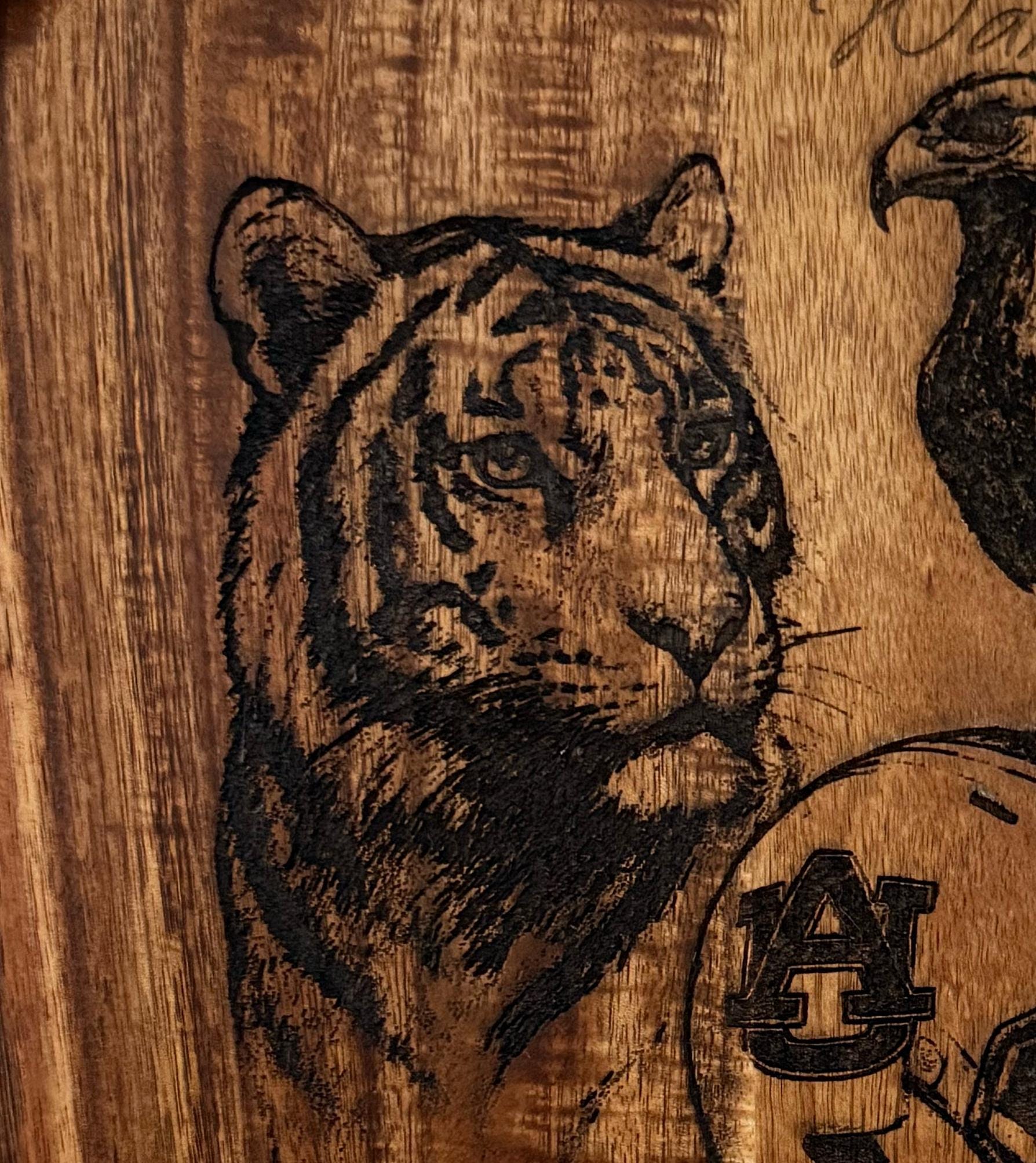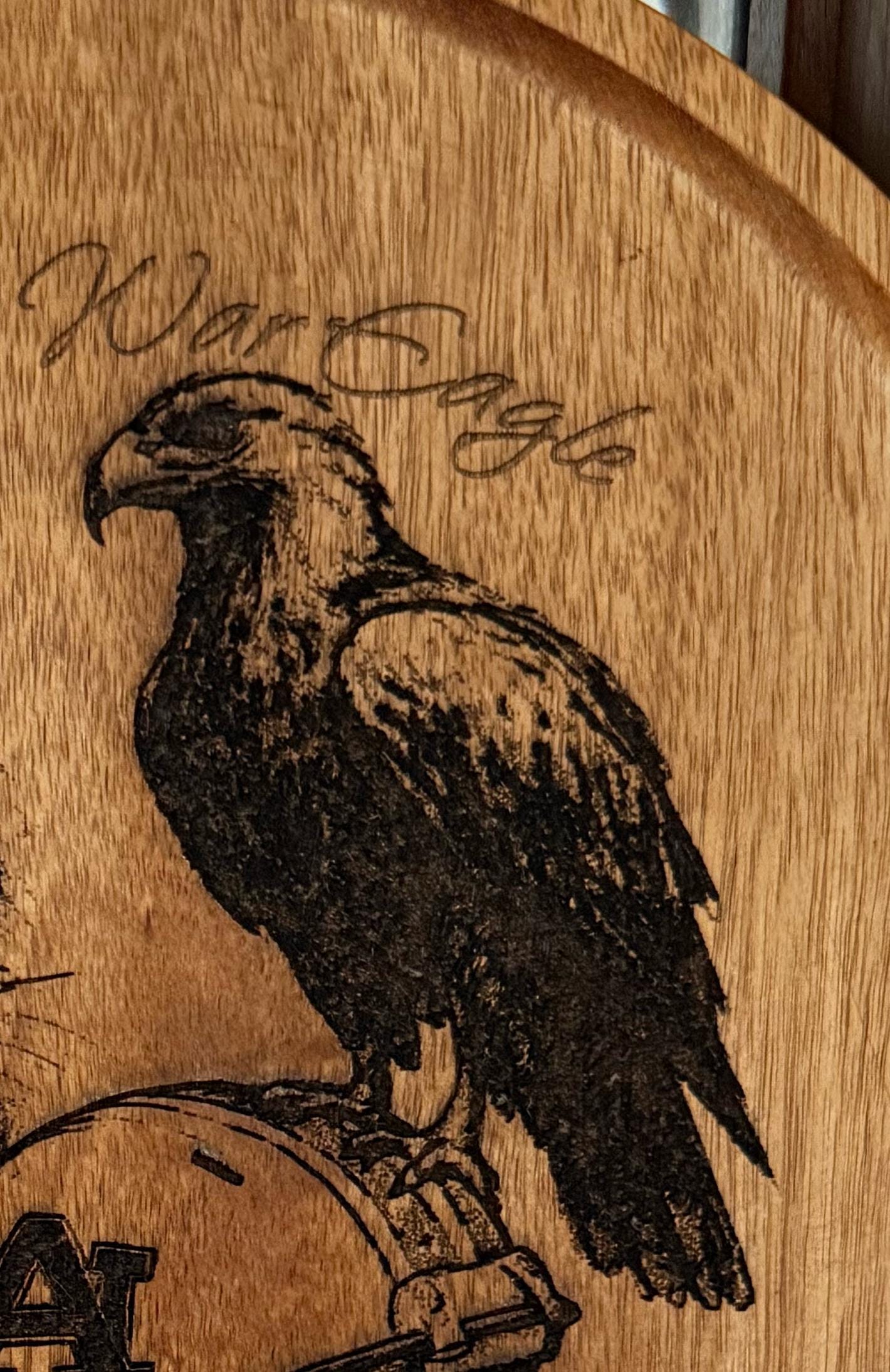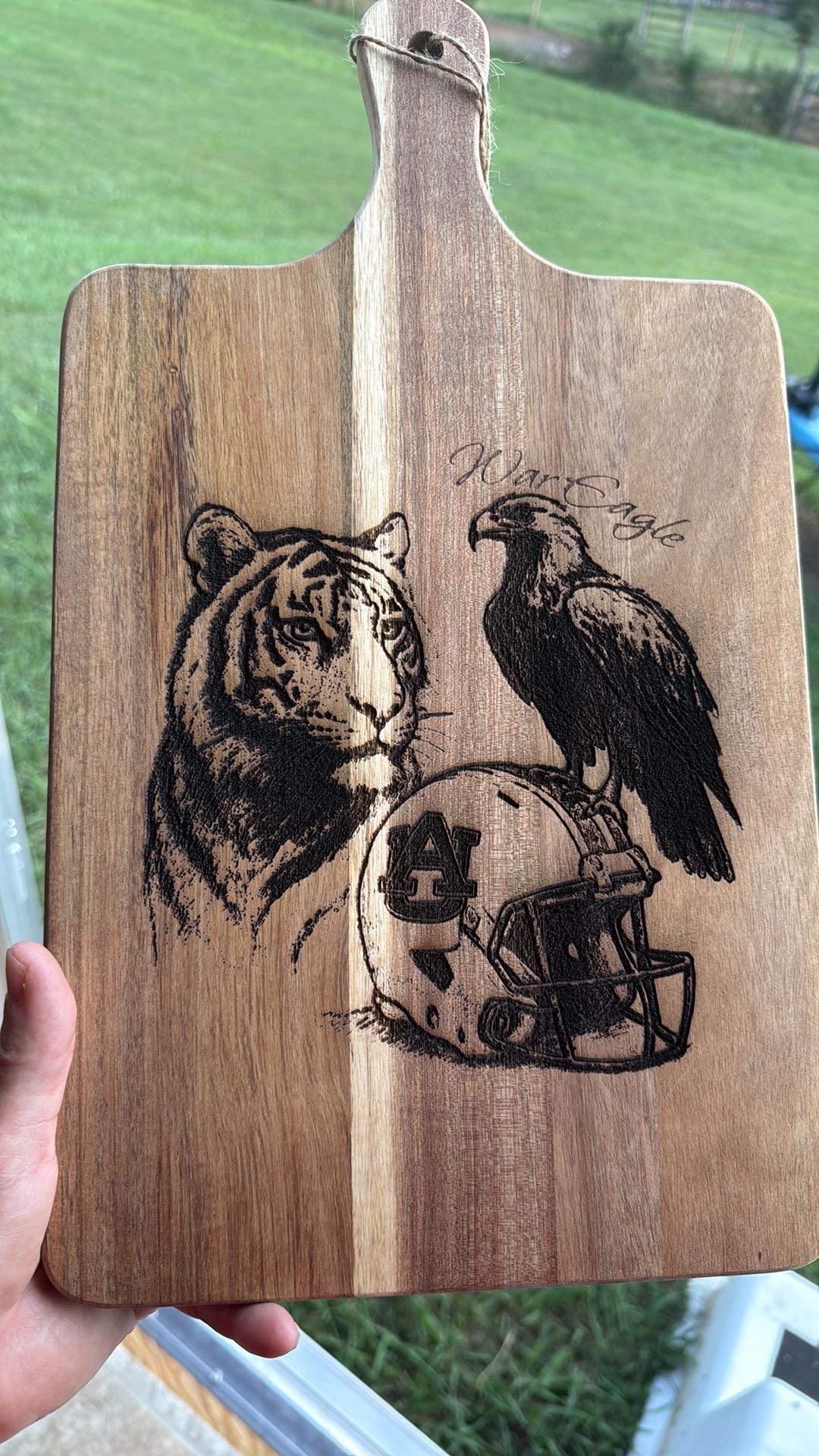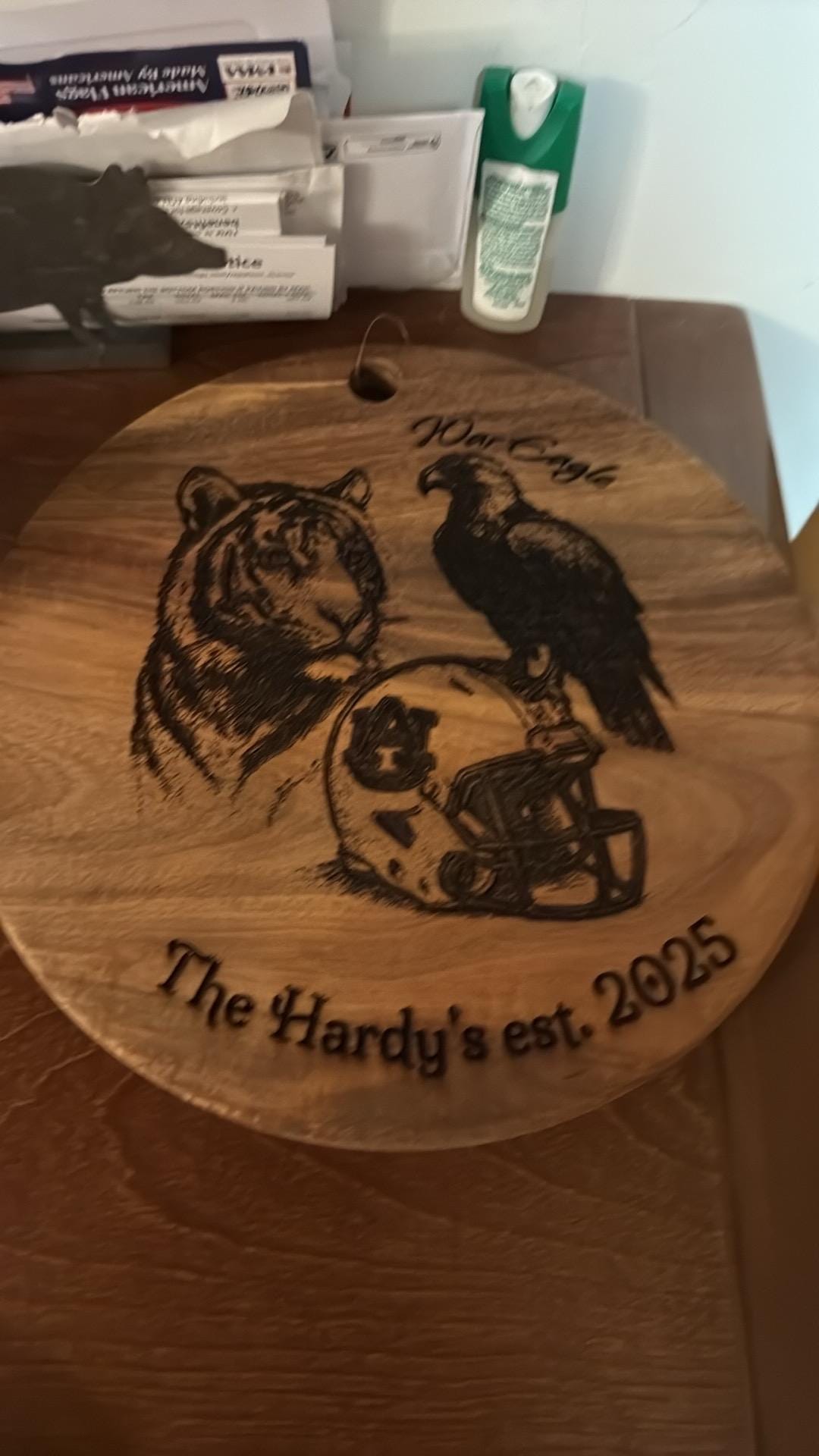 we use staff graphic illustrator skills and ai assist to create cutting boards and service plates that are a step above the standard logo product - when you or your fan has high standards, we are the place to come for that special gift. Each board or plate is designed and laser engraved created individually;